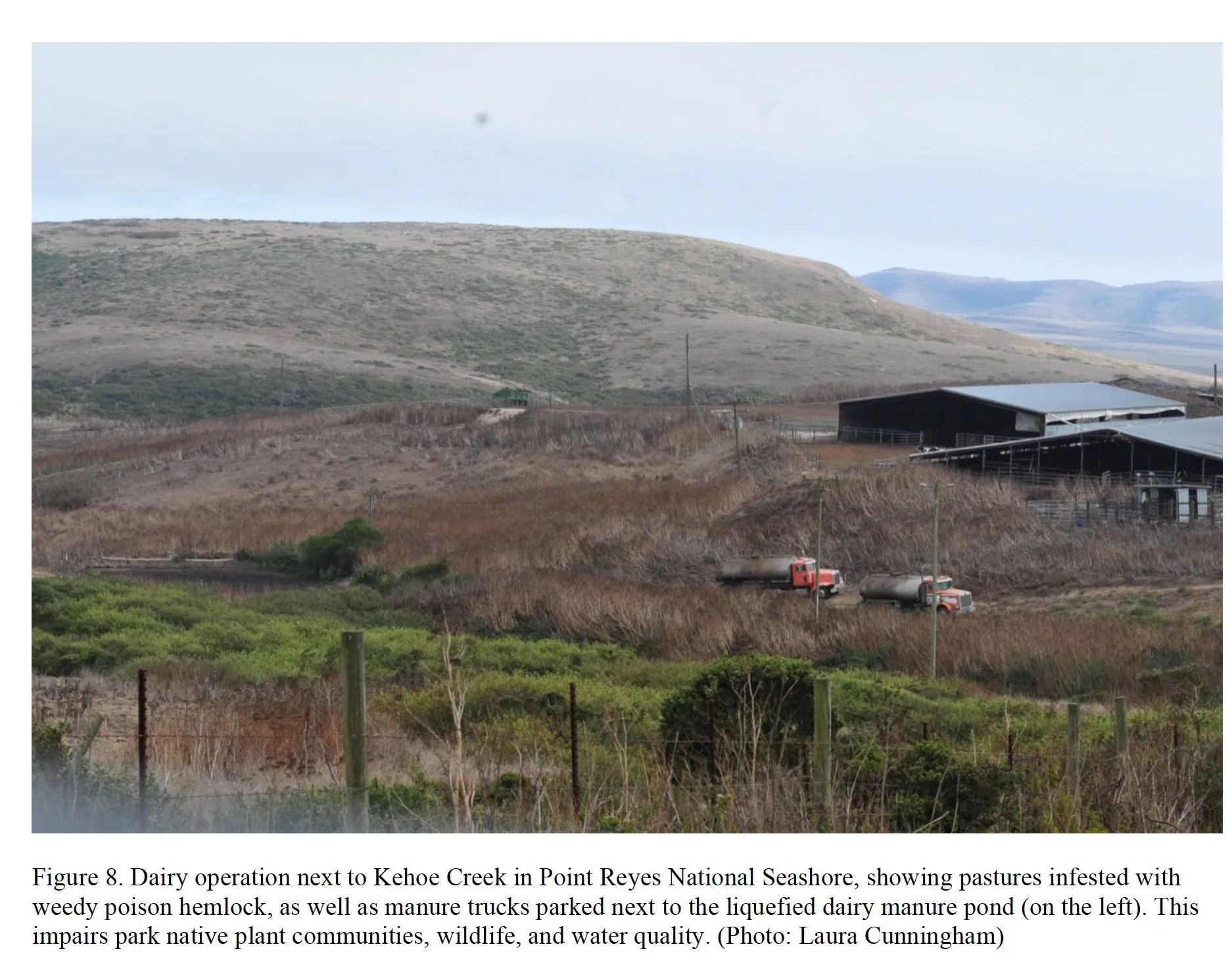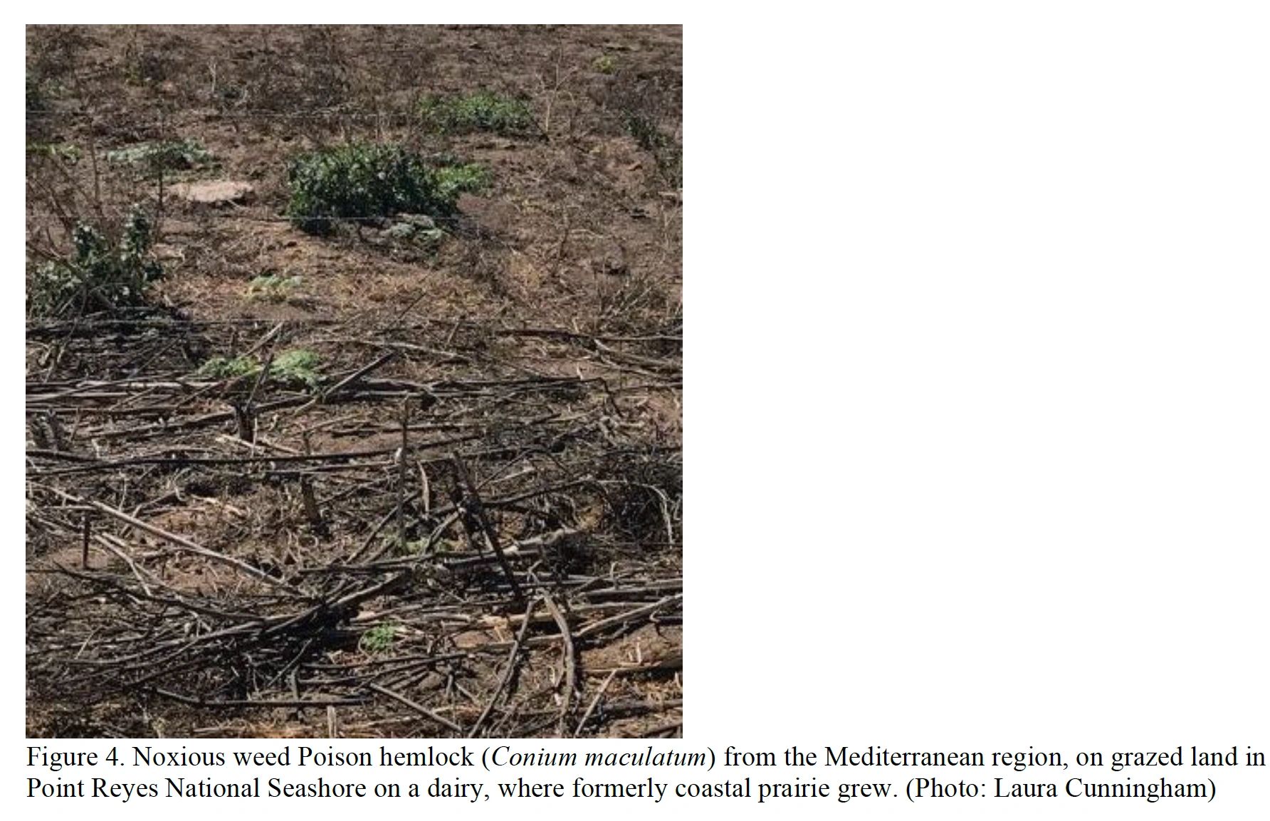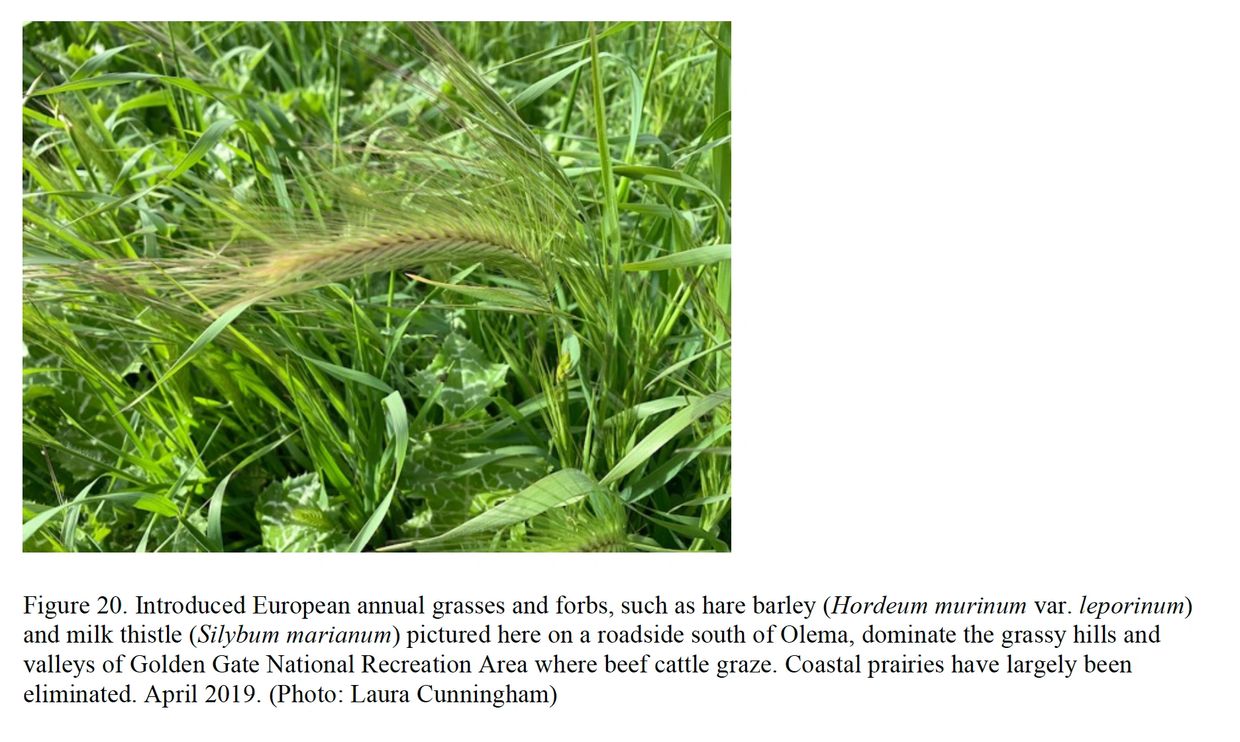 NPS should ban all plantings of silage for supplemental cattle feed, as these species are wholly inappropriate and counterproductive to maintaining native plant communities in a park unit. All mowing of native shrubs, tillage, seeding, and silage-harvesting should halt. These are not historic cultural farming practices, but modern dairy agriculture, using the latest silage seeds that are introducing genetic plant material into native communities. These areas should be restored to native coastal prairie and North coastal scrub. The bulk of the Pastoral Zone, consisting of California introduced annual grasslands dominated by European hare barley, ripgut brome, Italian ryegrass, and rattail fescue, should be rested from cattle grazing.