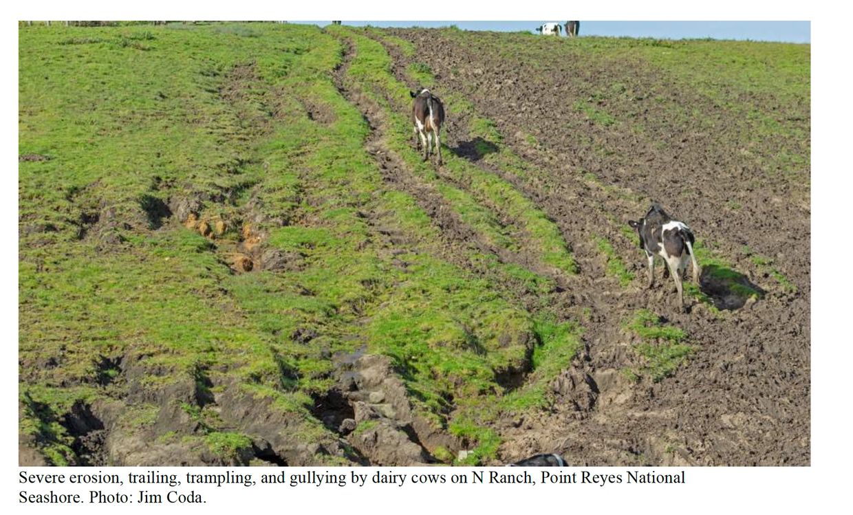 Livestock grazing can lead to soil compaction, massive soil erosion, and sediment flows into streams, which harm fish and aquatic invertebrates in freshwater streams, brackish lagoons, and nearshore ocean habitats. Cattle create trailing, high-impact areas next to feed troughs and water facilities, ranch core areas, and heavily grazed grasslands where topsoils are lost from trampling and erosion. Trampling from beef and dairy livestock also causes increase runoff during rain storms, as well as decreased vegetative cover to hold soils in place.
